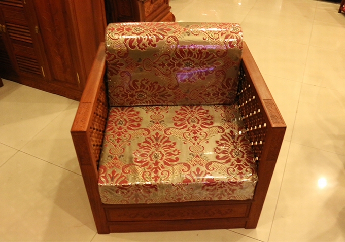 單人座沙發外觀方正匡整,兩邊扶手的高度設計的與靠背同高,而在其內外兩側均雕繪有幅闌的鏤空幾何紋飾作為點綴,彰顯著浮美淡雅的中國風式含蓄美。在沙發實際使用時,配上軟墊之后的坐感也更覺舒適,沙發座腳處地設計顯得地較為獨特,也可以說它已經將座腳處設計的概念完全融入了沙發整體,以之整體式的箱體結構作為座腳,更覺敦實、小巧玲瓏,頗有些許歐派家具式風格的韻味,實為別致。